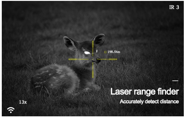 Наличие лазерного дальномера значительно расширяет возможности для ведения точной стрельбы на дальних дистанциях. Предельная дальность работы устройства – 600 метров, погрешность измерений ± 0,5 м. Данные измерений отображаются в поле зрения прибора. Стрелок может ориентироваться по расстоянию и брать соответствующие правки на дальность.