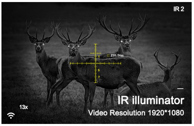 При переходе в ночной режим на дисплее транслируется черно-белое изображение. Большая глубина серого, позволяет максимально качественно прорисовать изображение наблюдаемых объектов. С использованием ИК осветителя стрелкам доступны для наблюдения цели расположенные на значительном удалении. Чувствительность сенсора на уровне 0.0001Lux позволяет получить детальное изображение даже при полном отсутствии освещения.